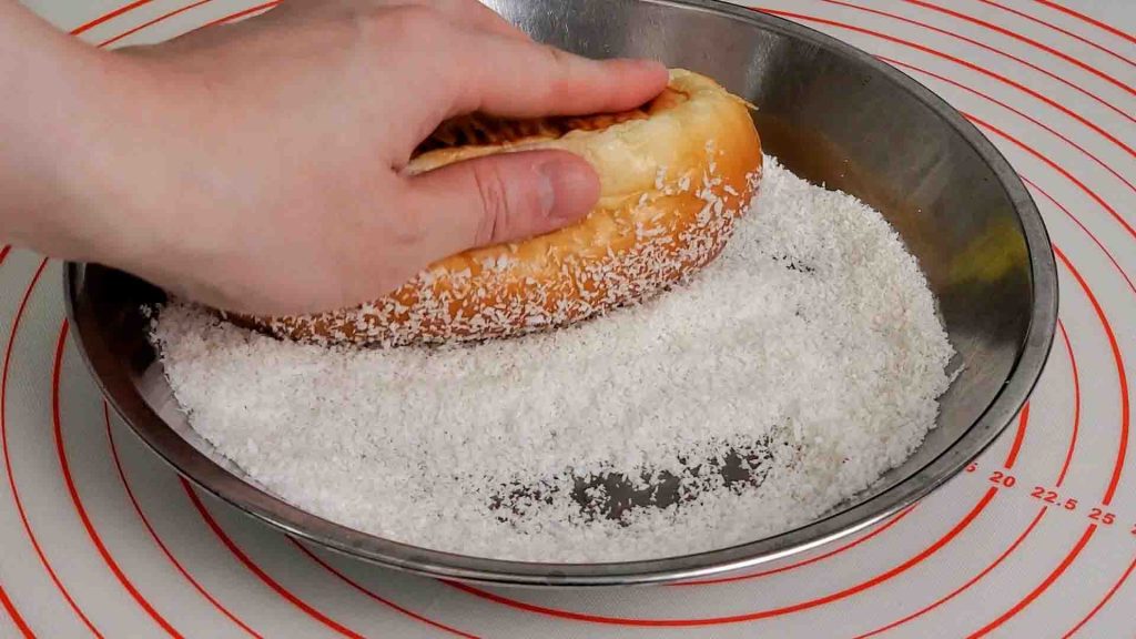 - Now dip the buns into some desiccated coconut, making sure to apply a generous amount of the coconut all over the top of the buns.