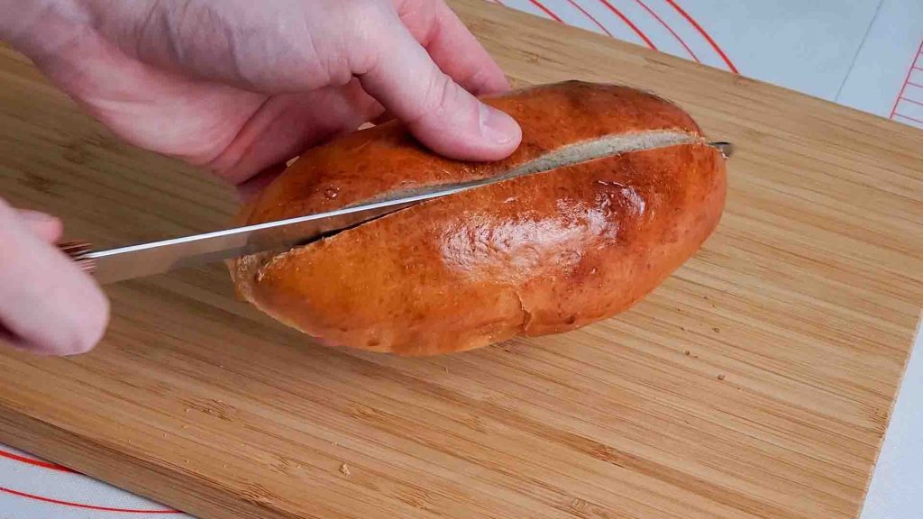 Once the buns have been baked, allow them to fully cool down before cutting into them. This will make it much easier to cut the buns and also allow you to make a cleaner cut.