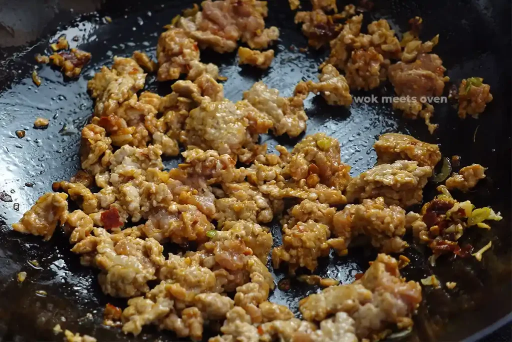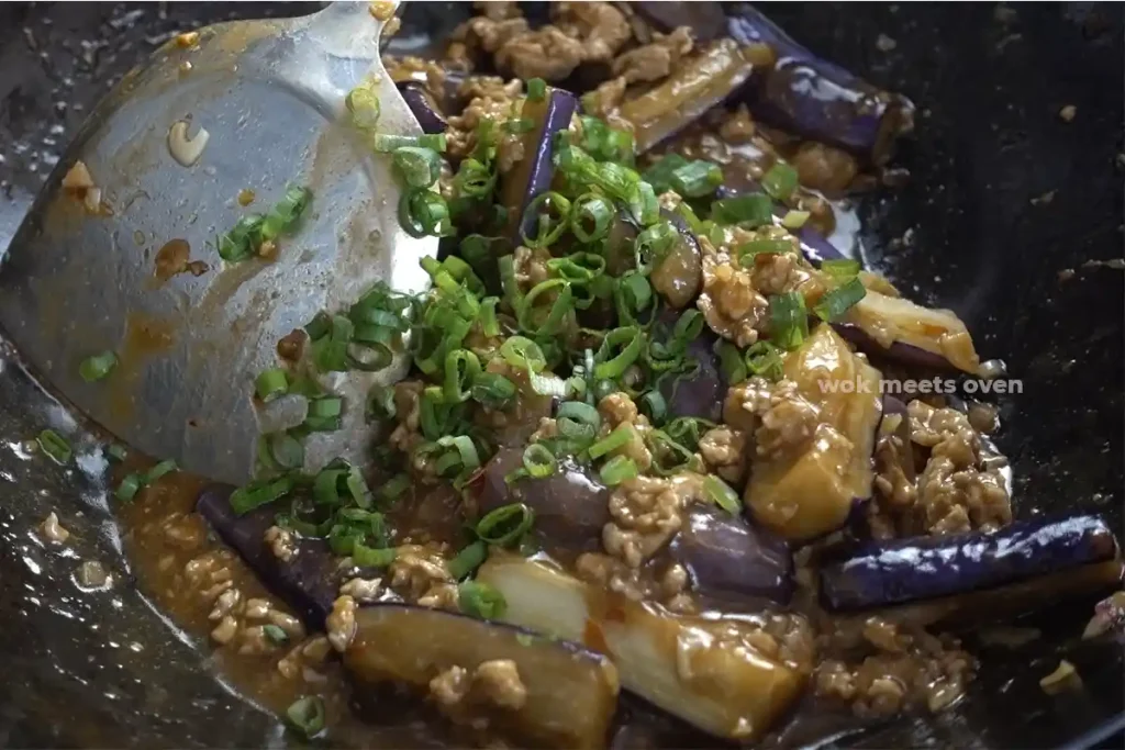 - Turn the heat up to medium-high heat and stir-fry everything for about a minute and then add in your cornstarch slurry to the sauce by pushing the ground pork and eggplant to the side, exposing the sauce.