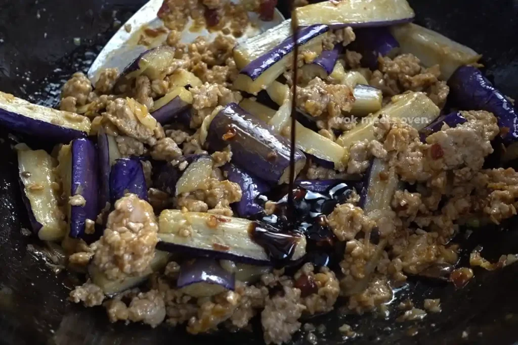 - Once the ground pork starts to turn whitish in colour and is about 80% done, add in your eggplant to the wok.