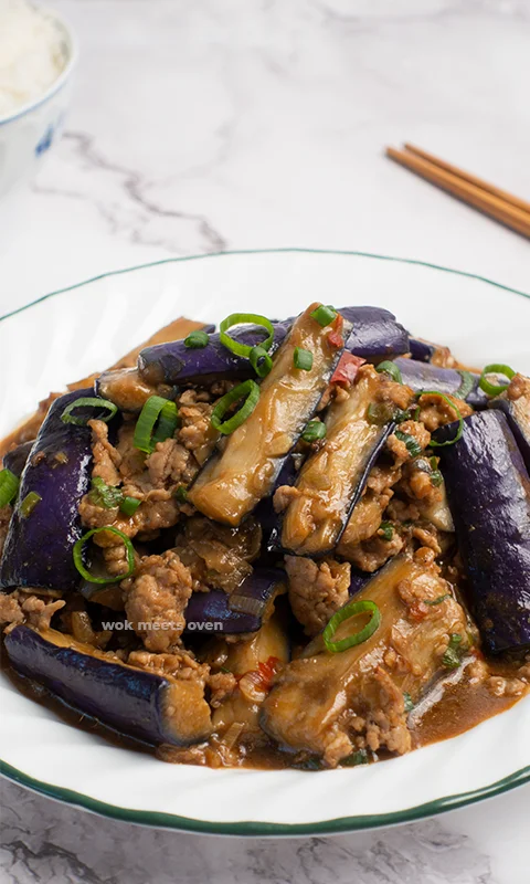 Typically this Chinese eggplant with minced pork dish is eaten with white rice instead of as a standalone dish. It may also be served with other Chinese dishes as well such as bok choy stir-fry.