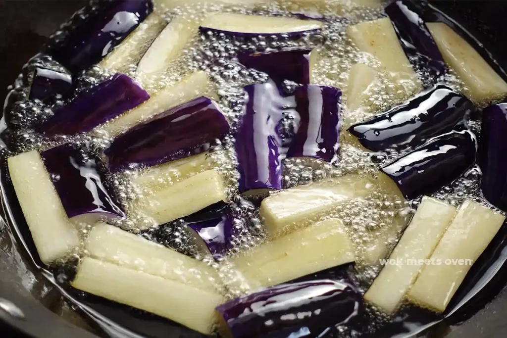 For this Chinese eggplant with minced pork recipe, we’re going to do things the old-fashioned way and that means frying the eggplants. This gives the eggplant a unique texture when you bite into them. Now since eggplants tend to function like a sponge and soak up liquid quite easily, we aren’t going to fry it for too long (1-2 minutes max) to keep the oil to a minimum.