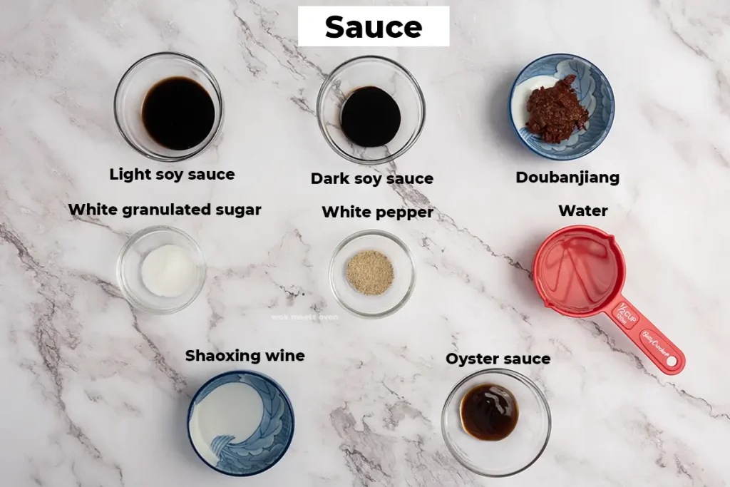- Then prepare the sauce by combining the light soy sauce, dark soy sauce, sugar, and oyster sauce in a bowl and set it aside.