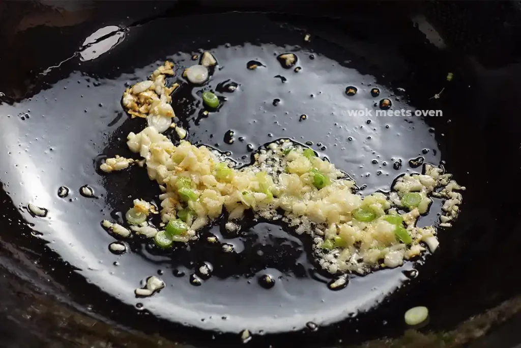 - Once the oil is hot enough, add in your minced garlic and ginger, along with the white parts of the green onion that you cut earlier.