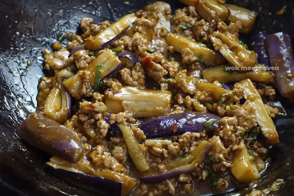The dish is known for its flavourful soft pieces of Chinese eggplant that are stir-fried with minced pork in a slightly spicy flavourful umami sauce.