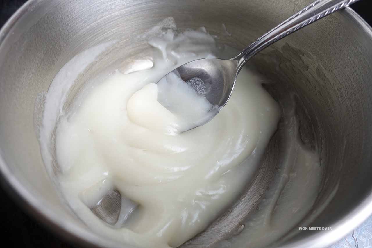 - Remove the Tangzhong from the stove and cover it with plastic wrap and store it in the fridge for at least 20 minutes to allow the Tangzhong to cool down.