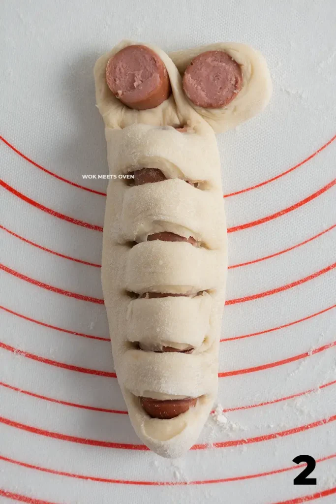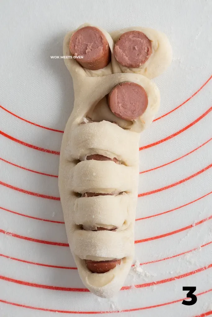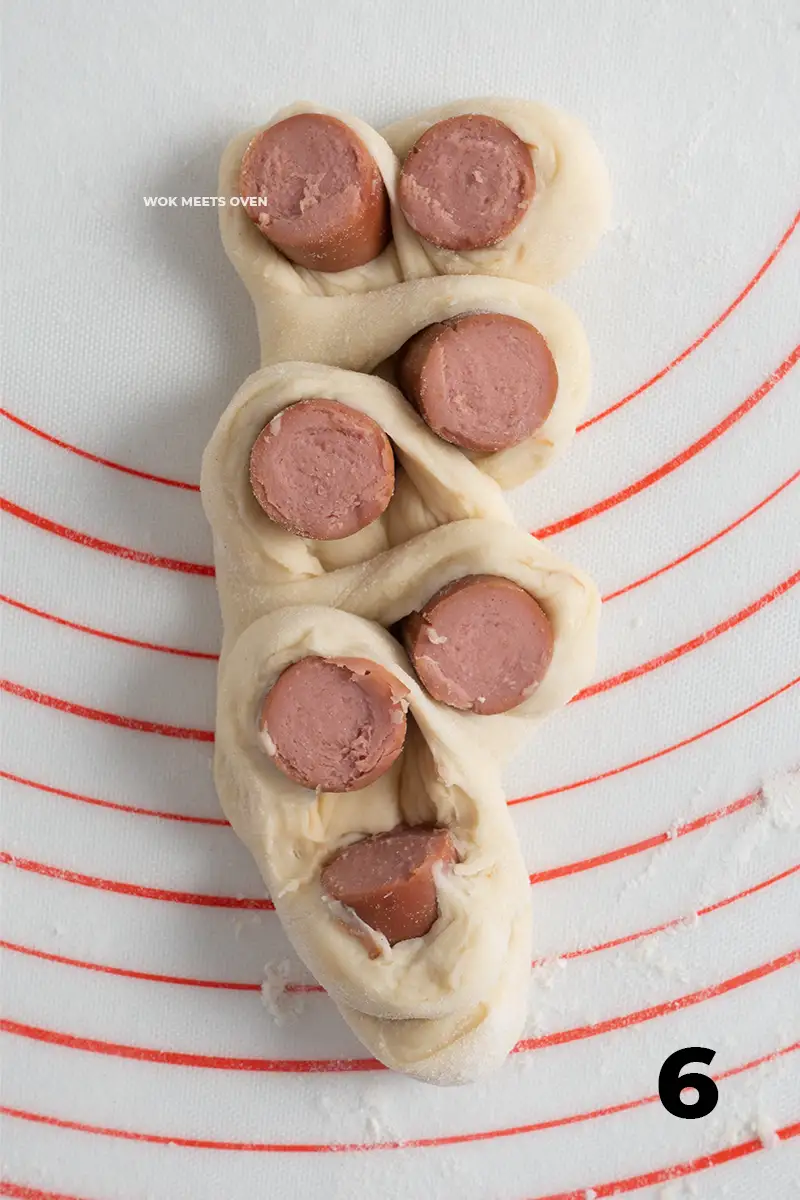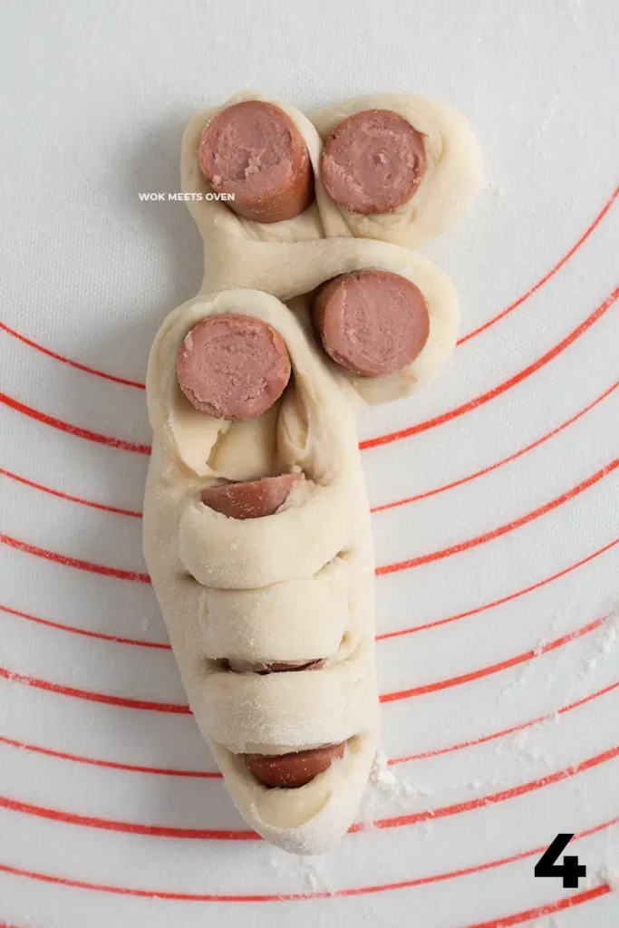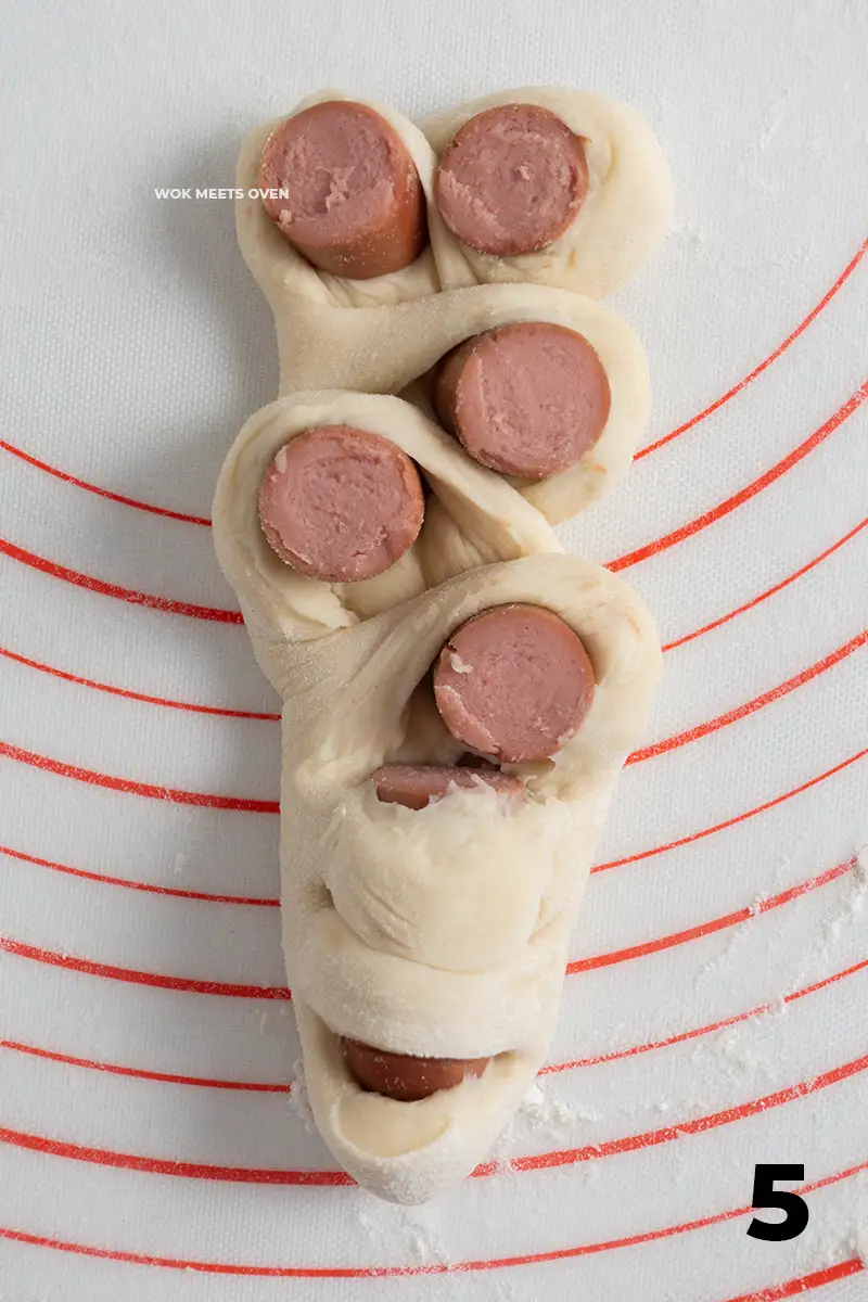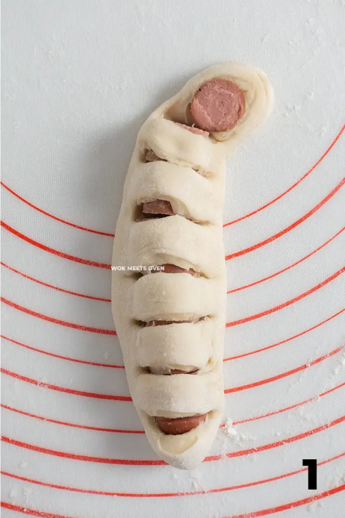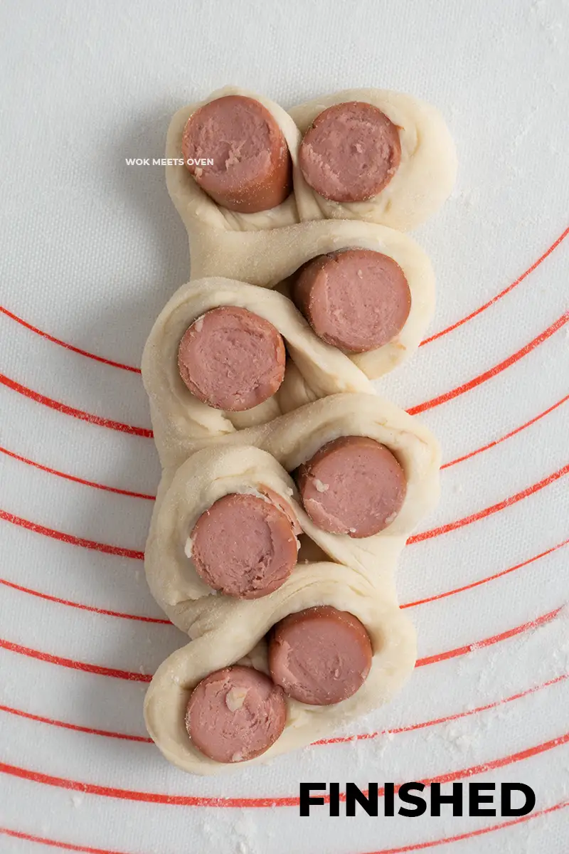 - Only cut the dough with the sausage inside to the point where the sausage is fully cut but there is still some dough left so that you can twist and manipulate the dough.
