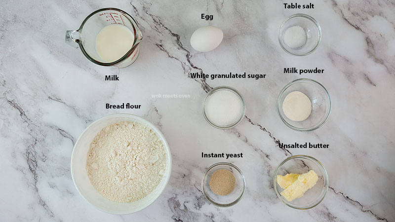 - In a stand mixer mixing bowl, we’re going to add in our bread flour, white granulated sugar, table salt, instant yeast, milk powder, an egg at room temperature, and our Tangzhong from earlier.