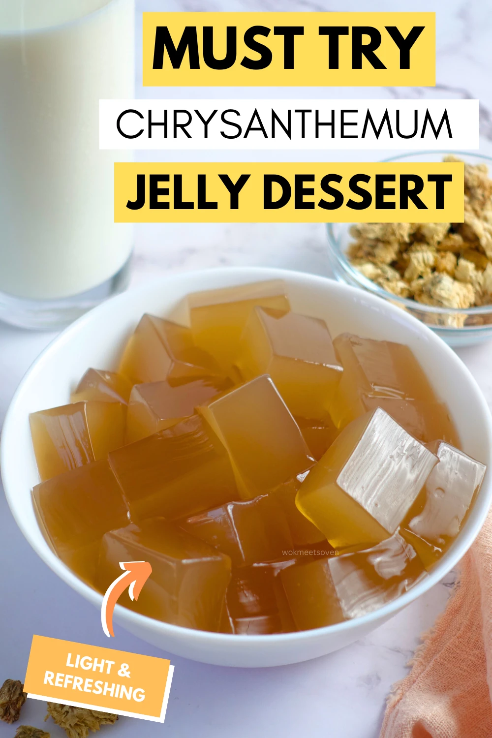 Chrysanthemum jelly is a Chinese dessert dish consisting of white jelly powder infused with the flavors of chrysanthemum flowers. This light and cool dessert is typically eaten when you’re looking to cool down or if you had too much “hot foods” and now you’re looking to “cool down” and rebalance the yin and yang in your body. If you’re Asian then you know what I’m talking about ๐คฃ. Sometimes you might see goji berries added in with the chrysanthemum jelly as well. This chrysanthemum jelly dessert recipe is packed full of chrysanthemum flavor and isn’t overly sweet unless you go overboard with the sugar syrup!