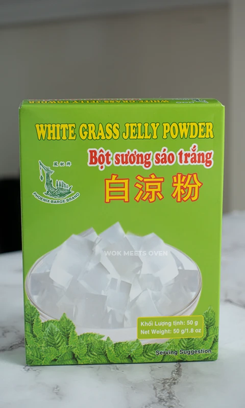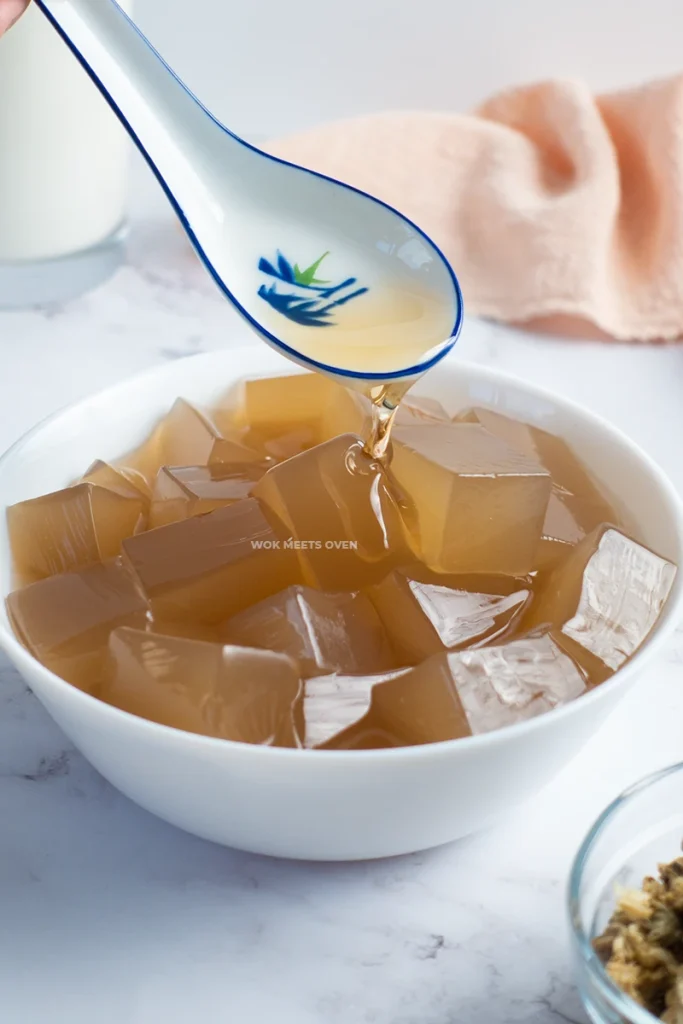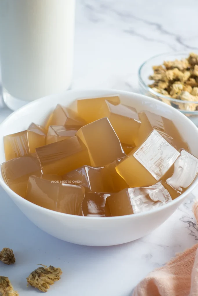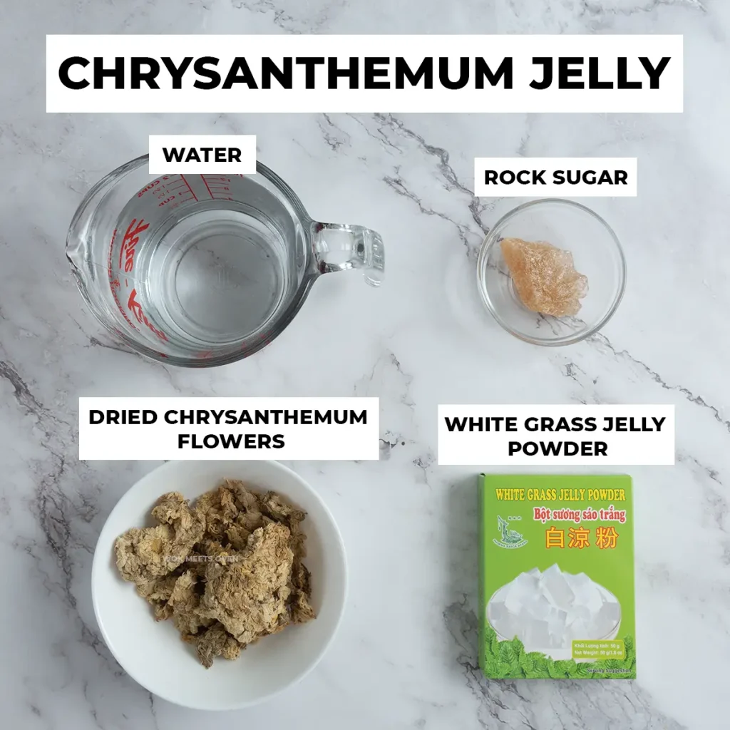 White grass jelly powder: You can use any brand of white grass jelly powder that you find at an Asian grocery store but make sure that it’s white grass jelly and not black grass jelly or flavored jelly as we will be infusing the flavor of chrysanthemum with the white jelly.