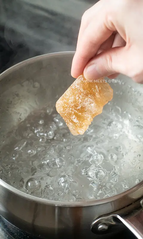 - Add your water to a medium sized pot and bring it to a boil and then add in the rock sugar when itโs boiling and allow it to fully melt.