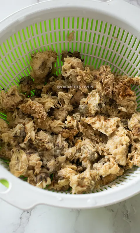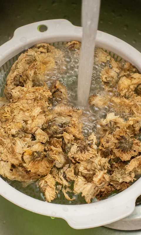- Wash and strain the chrysanthemum flowers and set them aside to dry.