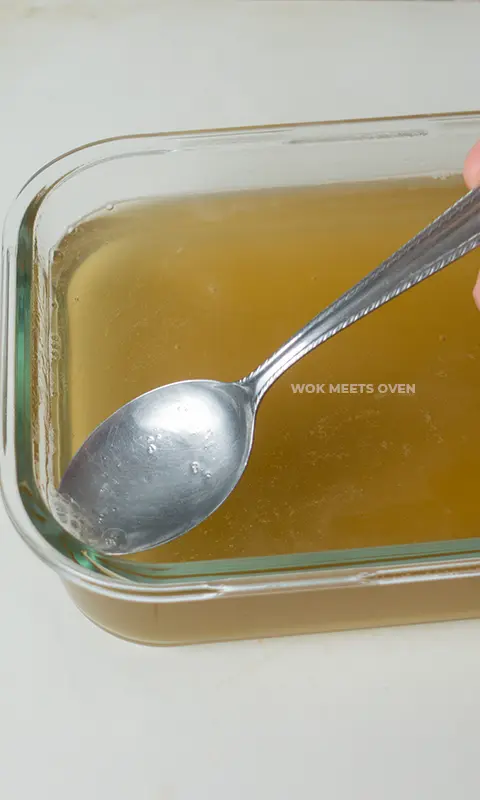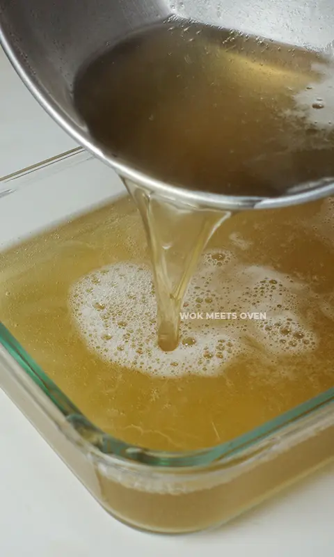 - Use a toothpick and a spoon to scoop out and pop any bubbles on the surface of the chrysanthemum jelly when pouring it out onto a container to make the surface look nice and smooth