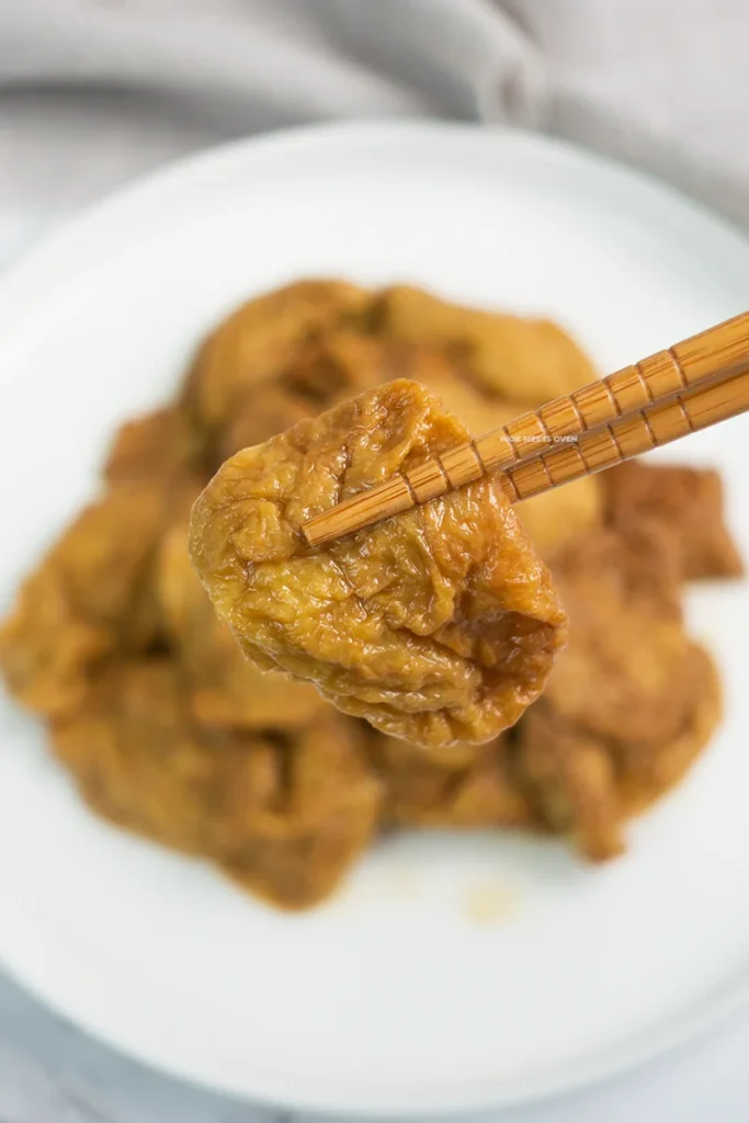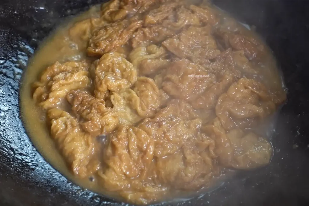 The gluten puffs are then drained and later combined with a plethora of delicious sauces as such sweet and sour sauce, curry sauce, and oyster sauce.