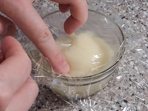 - Then remove the pan from the stove and transfer it to a small bowl or dish. Cover it with plastic wrap and then store in the fridge and let it cool down for at least 30 minutes before using.