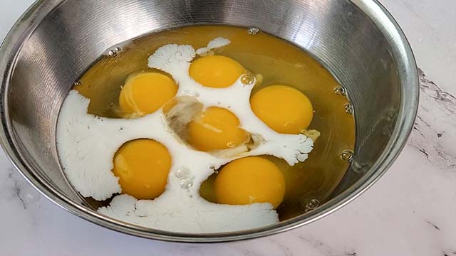 - Then crack 6 eggs into a bowl and add in your milk, salt, and vegetable oil.