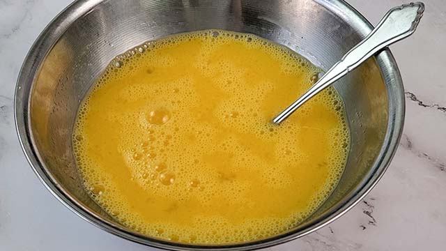 - Then using a strainer, pour the eggs through the strainer to remove any impurities from the egg mixture.