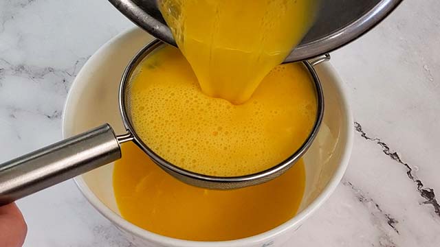Then using a strainer, pour the eggs through the strainer to remove any impurities from the egg mixture.