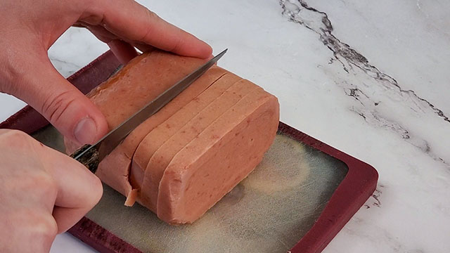 - Open a can of spam and slice 6 medium sized slices of spam.