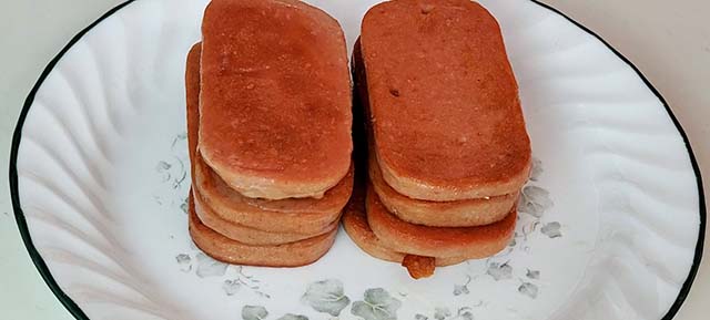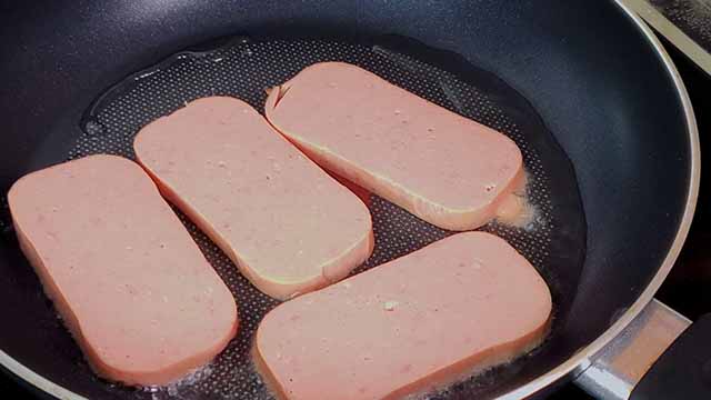 - Brown both sides of the spam and then transfer the spam to a plate and set it aside.