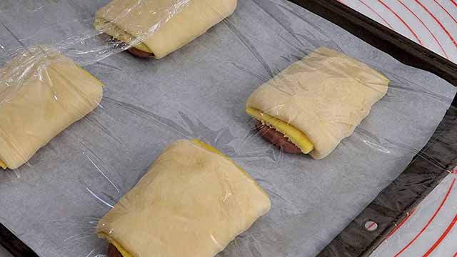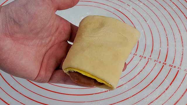 - Now grab one end of the dough and wrap it over the spam and egg and do the same with the other end of the dough.
