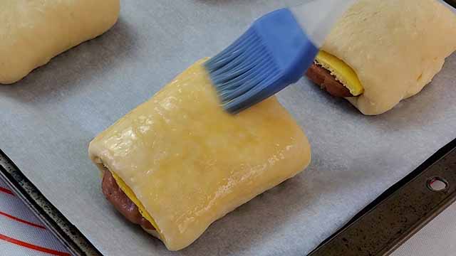 - Once the buns are done proofing, apply the egg wash to the buns.