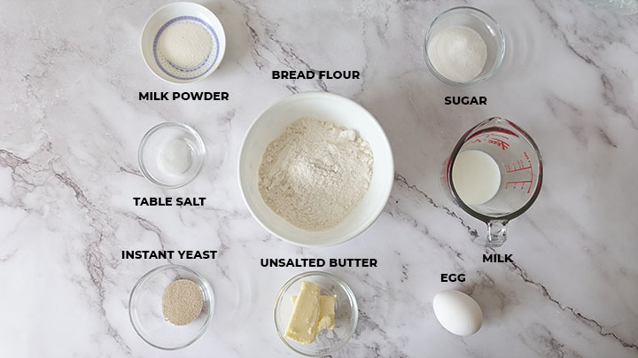 - In another large mixing bowl, add in your bread flour, sugar, salt, instant yeast, milk powder, and the cooled down Tangzhong from earlier.