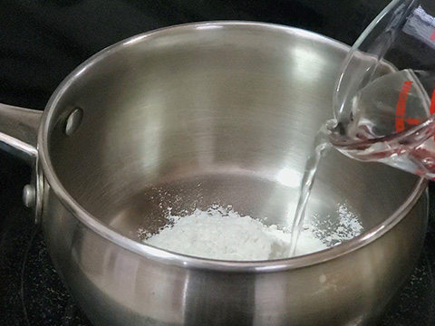 - To start, we're going to make our Tangzhong. In a small sauce pan, add in your bread flour and water.