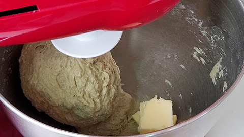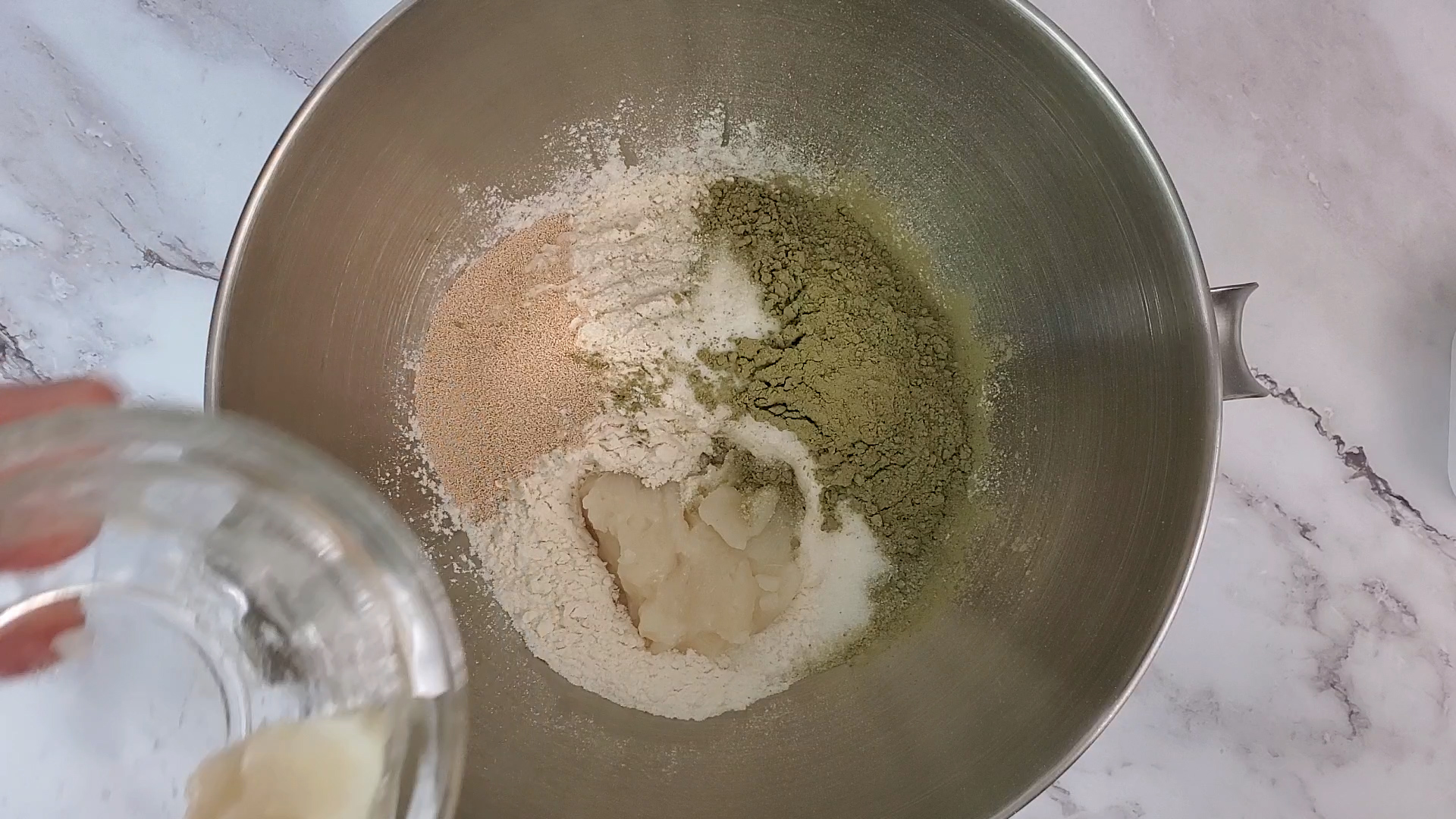 - Next, in a large mixing bowl, add in your bread flour, sugar, salt, instant yeast, matcha powder, and the Tangzhong from earlier.