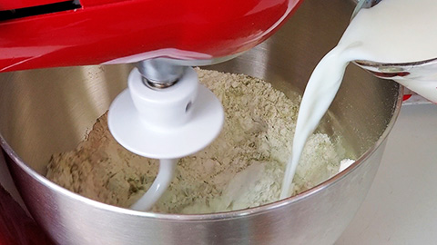 - Now using a stand mixer, give the dough mixture a quick few whisks then slowly add in your milk.