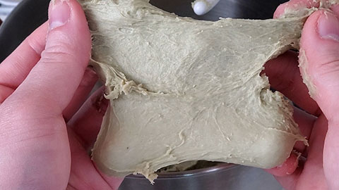 - You can check when the dough is done kneading by grabbing a small piece of the dough and stretching it out until light can pass through it and it becomes translucent. If it doesn't tear then it is ready.