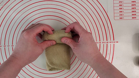 - Then fold one end about 2/3 of the way inwards and then fold the other end 1/3 of the way inwards to cover the dough.