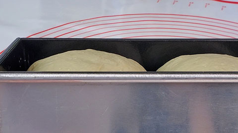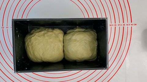 - Now grease a bread loaf pan with a lid and then place both pieces of dough inside of the pan with the short sides of the dough facing the short side of the pan. I'm using a 450g bread loaf pan here.