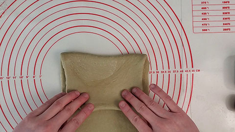 - Then fold one end about 2/3 of the way inwards and then fold the other end 1/3 of the way inwards to cover the dough.
