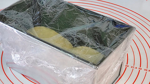 - Cover the bread loaf pan now with either some plastic wrap or a towel and let it rise in a warm place until the dough is about 1 inch below the top of the pan.
