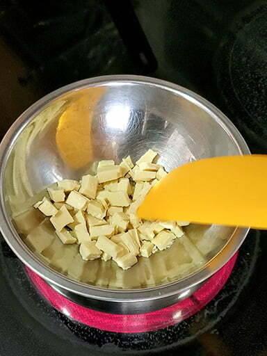 For the glaze, we will melt the white chocolate over a water bath (bowl filled with chocolate on top of a sauce pan filled with hot water). If you’re using a chocolate bar you will need to chop up the chocolate into small pieces. You can omit this step if you’re using white chocolate chips.