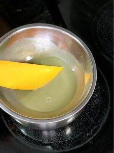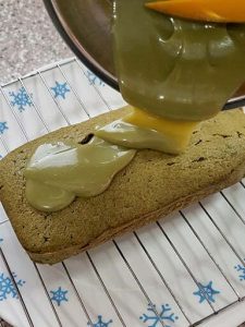 Pour the glaze over the Matcha pound cake when it’s finished baking.