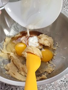 - Then add in 2 eggs, your sour cream, and vanilla extract.