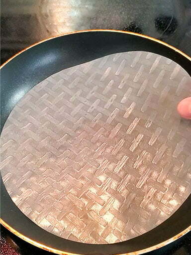 - Heat a flat frying pan over low heat and add in 1 piece of rice paper once the pan has been sufficiently heated.