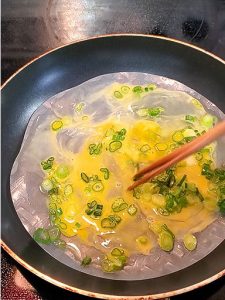 Next add in your chopped green onions & 1 egg on top of the rice paper. Immediately start stirring and mixing everything together making sure to get the egg and green onions evenly spread out all over the rice paper.
