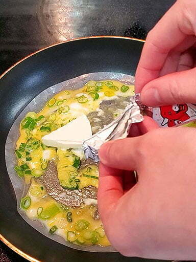 - Next add in your chopped green onions & 1 egg on top of the rice paper. Immediately start stirring and mixing everything together making sure to get the egg and green onions evenly spread out all over the rice paper.
