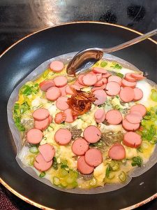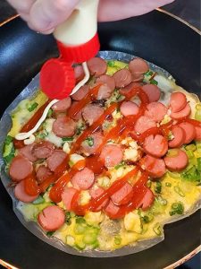 - Then add in your chopped hotdog or sausage onto the rice paper and mix it well with everything along with the fried shallots.