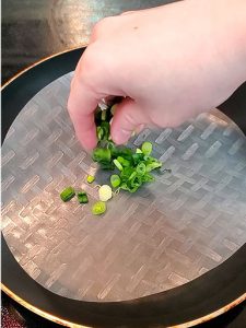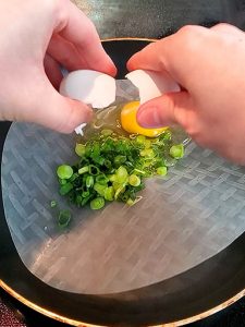 - Next add in your chopped green onions & 1 egg on top of the rice paper. Immediately start stirring and mixing everything together making sure to get the egg and green onions evenly spread out all over the rice paper.