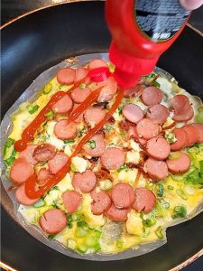 - Then add in your chopped hotdog or sausage onto the rice paper and mix it well with everything along with the fried shallots.